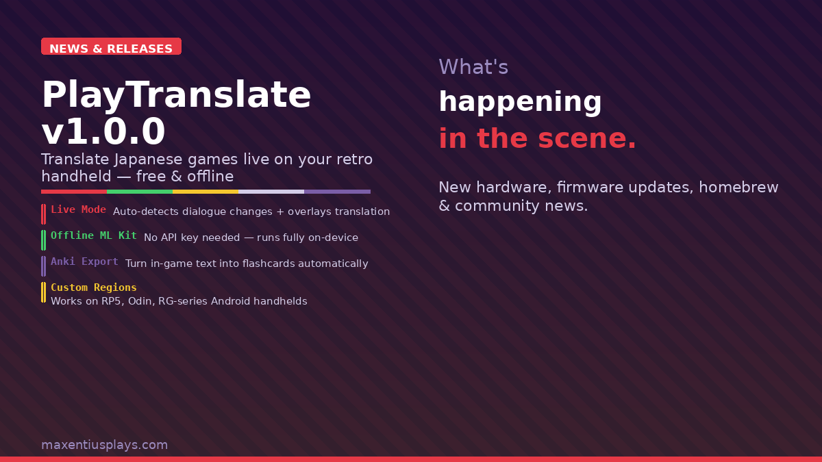 PlayTranslate v1.0.0 — free in-game Japanese translation for Android retro handhelds. (Image: Maxentius Plays / generated)